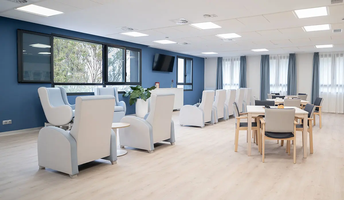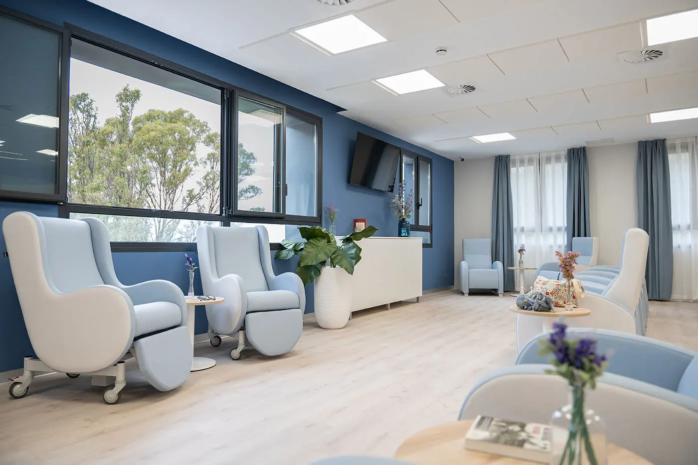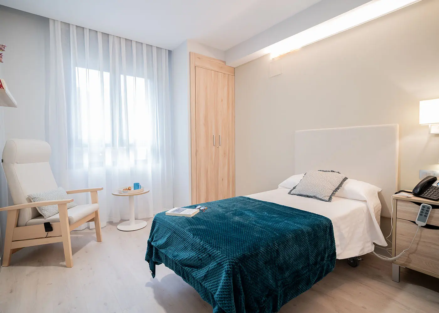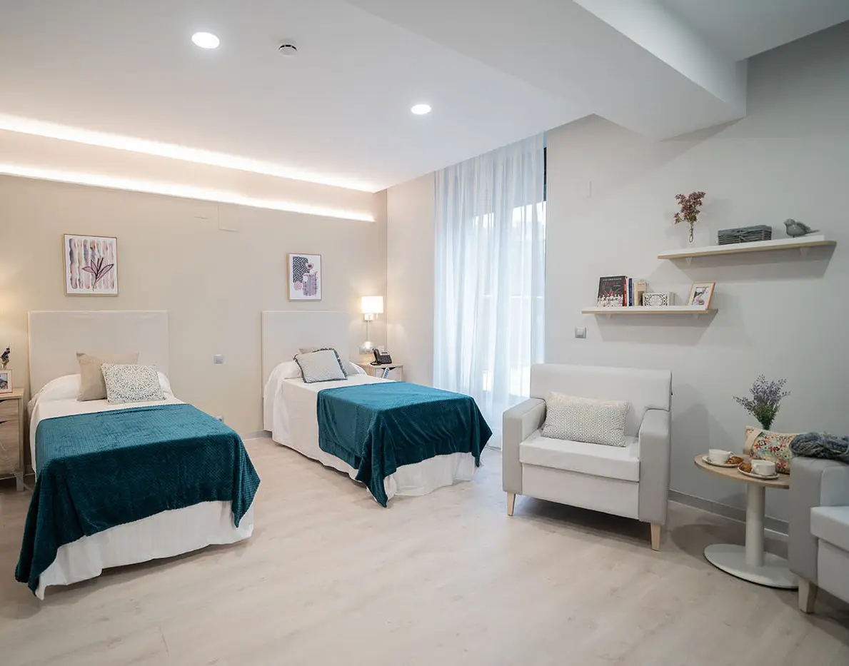 Las habitaciones (dobles e individuales) se distribuirán desde la planta baja hasta la cuarta planta, contando cada planta con su propio comedor y salón social. Todas las habitaciones son exteriores, con amplios ventanales que permiten una mayor entrada de luz natural y están perfectamente adaptadas a personas con movilidad reducida. Están igualmente equipadas con camas articuladas eléctricas, televisión, teléfono, aire acondicionado, sistema de aviso paciente-enfermera y videovigilancia.