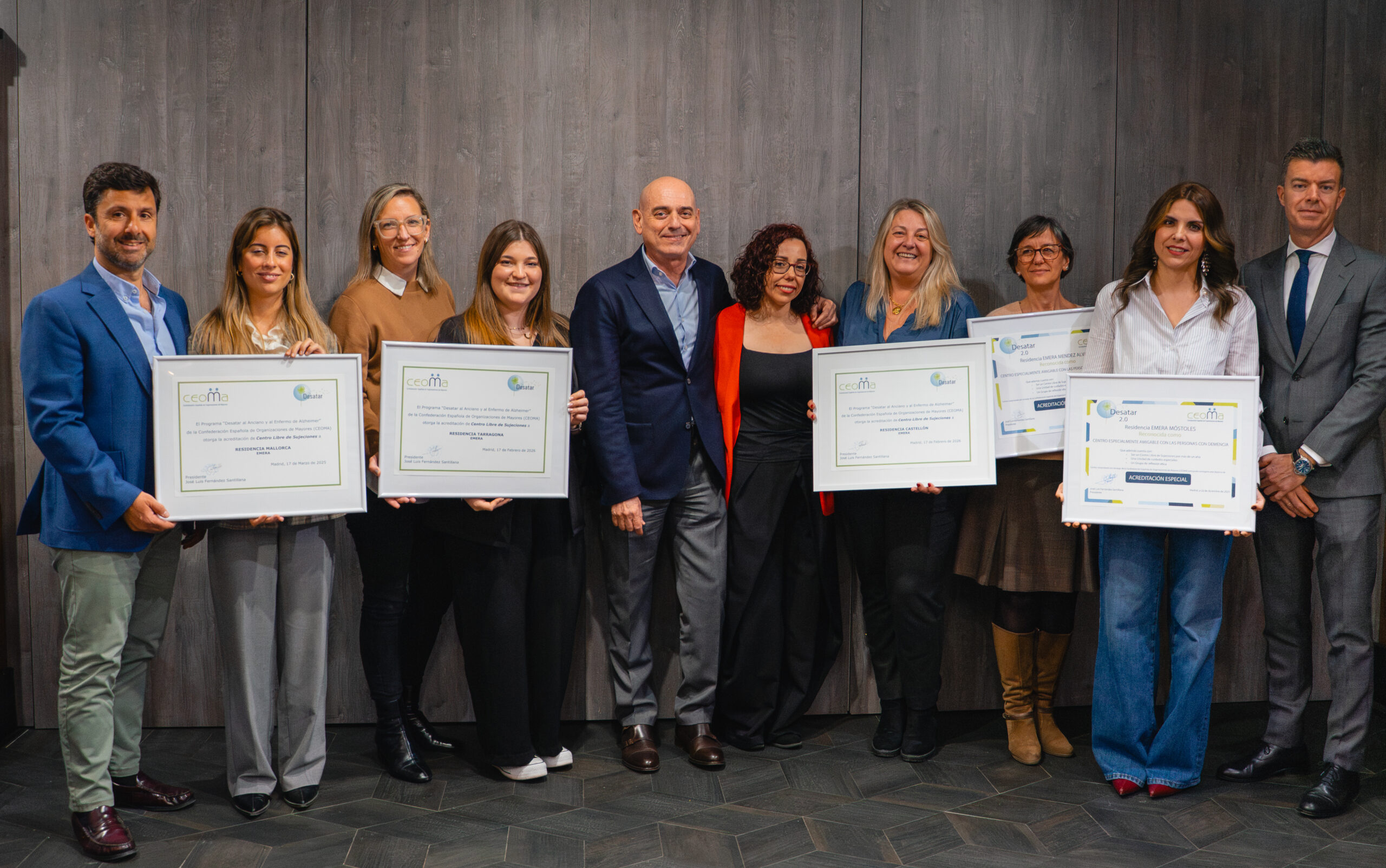 La Confederación Española de Organizaciones de Personas Mayores (CEOMA) ha otorgado a Emera Móstoles y Emera Méndez Álvaro la acreditación de «Centros Amigables con las personas con Demencia», respectivamente en diciembre 2025 y febrero 2026. Con ocasión de una reunión de trabajo con todas las direcciones de los centros Emera en Madrid, el 25 de febrero de 2026, se ha procedido a la entrega oficial de las acreditaciones de la mano de Javier Romero Reina, Director General de Emera España, Jorge Delgado Martín, Director de Operaciones, y Ana María García González, Directora Técnico-Asistencial y Calidad.