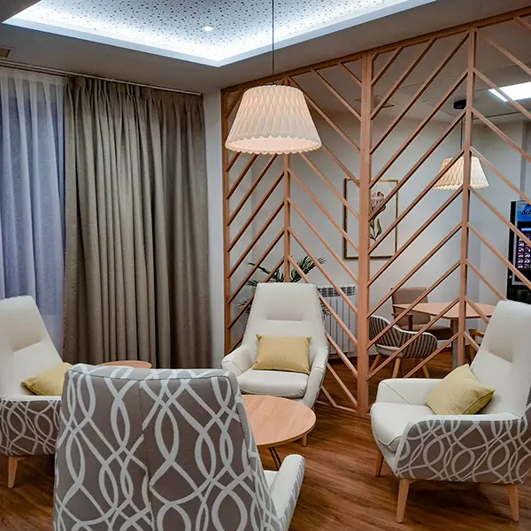 La iluminación también juega un papel fundamental en el diseño terapéutico. Se han utilizado diferentes tipos de luz para crear ambientes diferenciados y adaptados a las necesidades de cada espacio. La luz natural se aprovecha al máximo en las zonas comunes, mientras que en las habitaciones se ha optado por una iluminación más cálida y tenue, que favorece el descanso y la relajación.