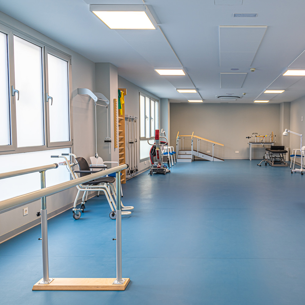 En la planta baja principal, se encuentran: la recepción, el gimnasio y la sala de rehabilitación, dotados del equipamiento necesario para llevar a cabo todo tipo de tratamientos de fisioterapia. En esta misma planta se sitúan también, los despachos de dirección, animación sociocultural, medicina y enfermería.