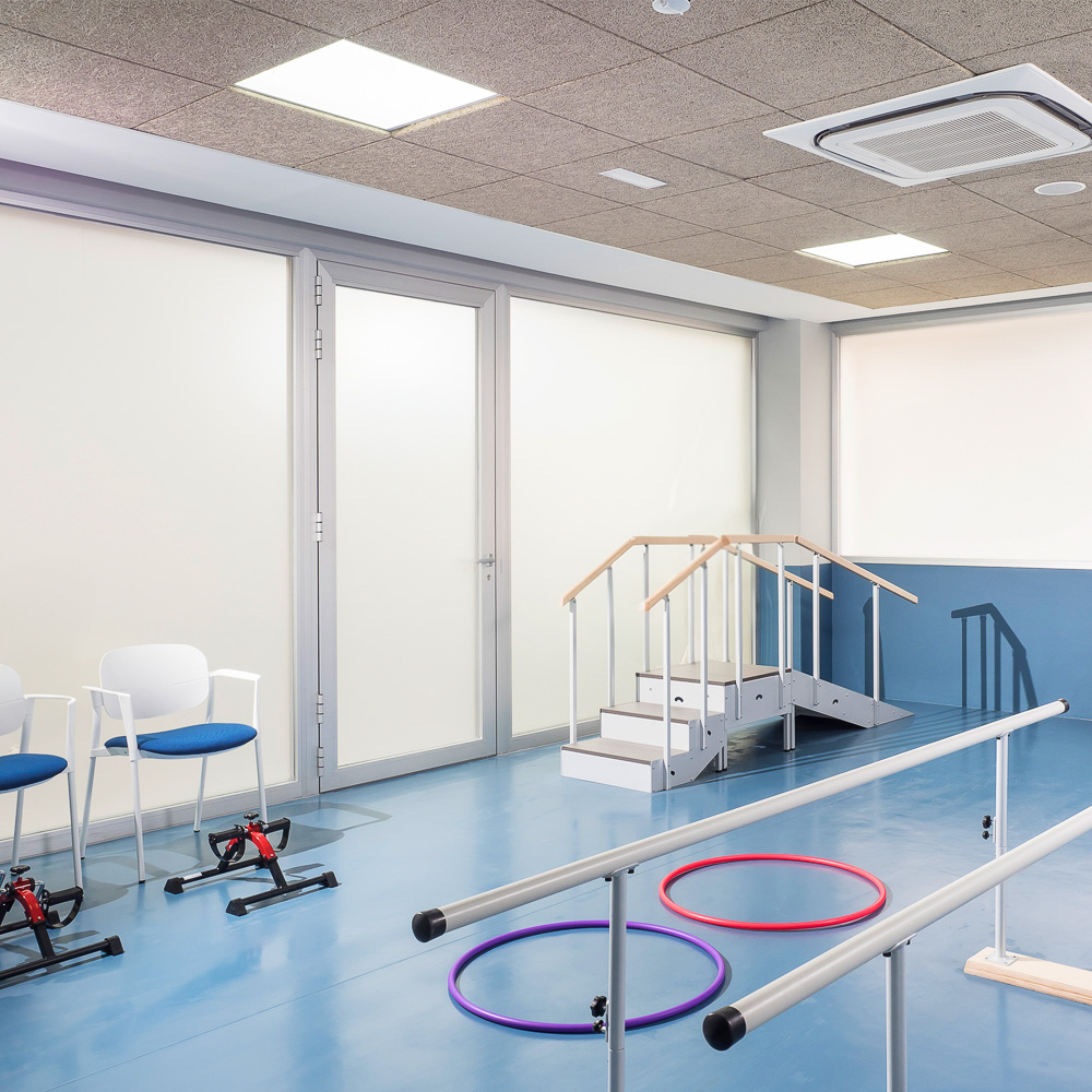 En la planta baja principal, se encuentran: la recepción, el gimnasio y la sala de rehabilitación, dotados del equipamiento necesario para llevar a cabo todo tipo de tratamientos de fisioterapia. En esta misma planta se sitúan también, los despachos de dirección, trabajado social, psicología, terapia ocupacional. En la planta primera, se encuentran los despachos de medicina y enfermería.